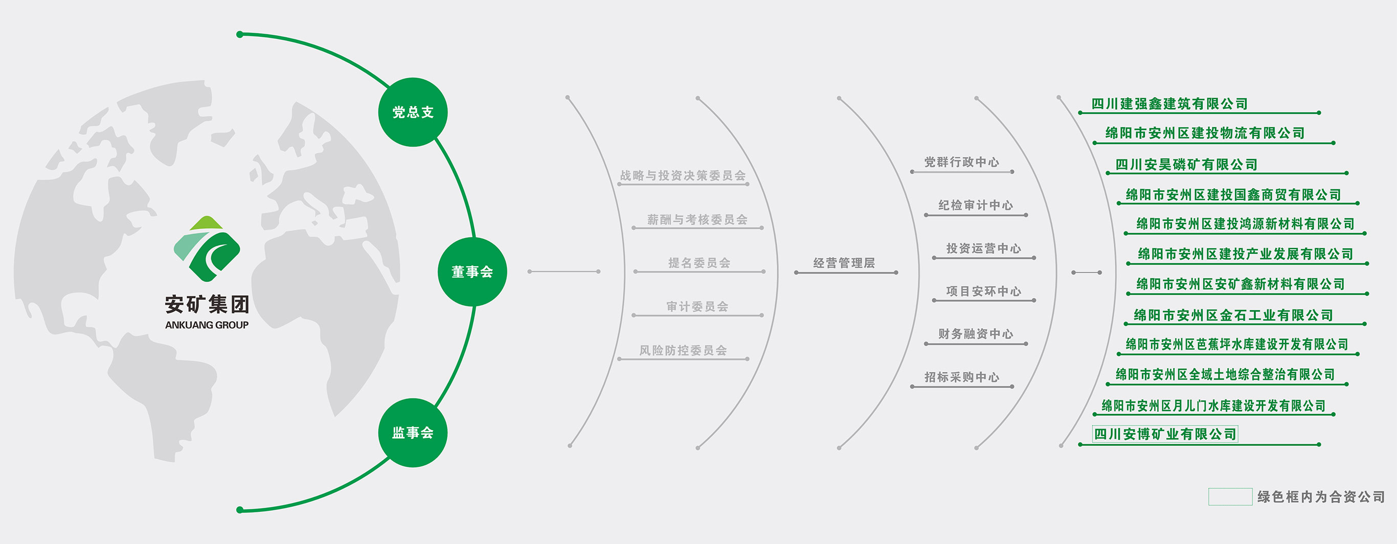 綿陽安州礦產(chǎn)資源集團(tuán)有限公司(原綿陽市安州區(qū)建投礦業(yè)有限公司,以下簡稱“安州礦產(chǎn)集團(tuán)”)成立于2020年6月,是經(jīng)區(qū)委、區(qū)政府批準(zhǔn)設(shè)立,區(qū)國資辦直接監(jiān)管的一級區(qū)屬國有獨資企業(yè),注冊資本金2億元。集團(tuán)內(nèi)設(shè)6個職能中心,下設(shè)11家全資子公司和1家合資公司,現(xiàn)有員工60余人,黨員30余人。